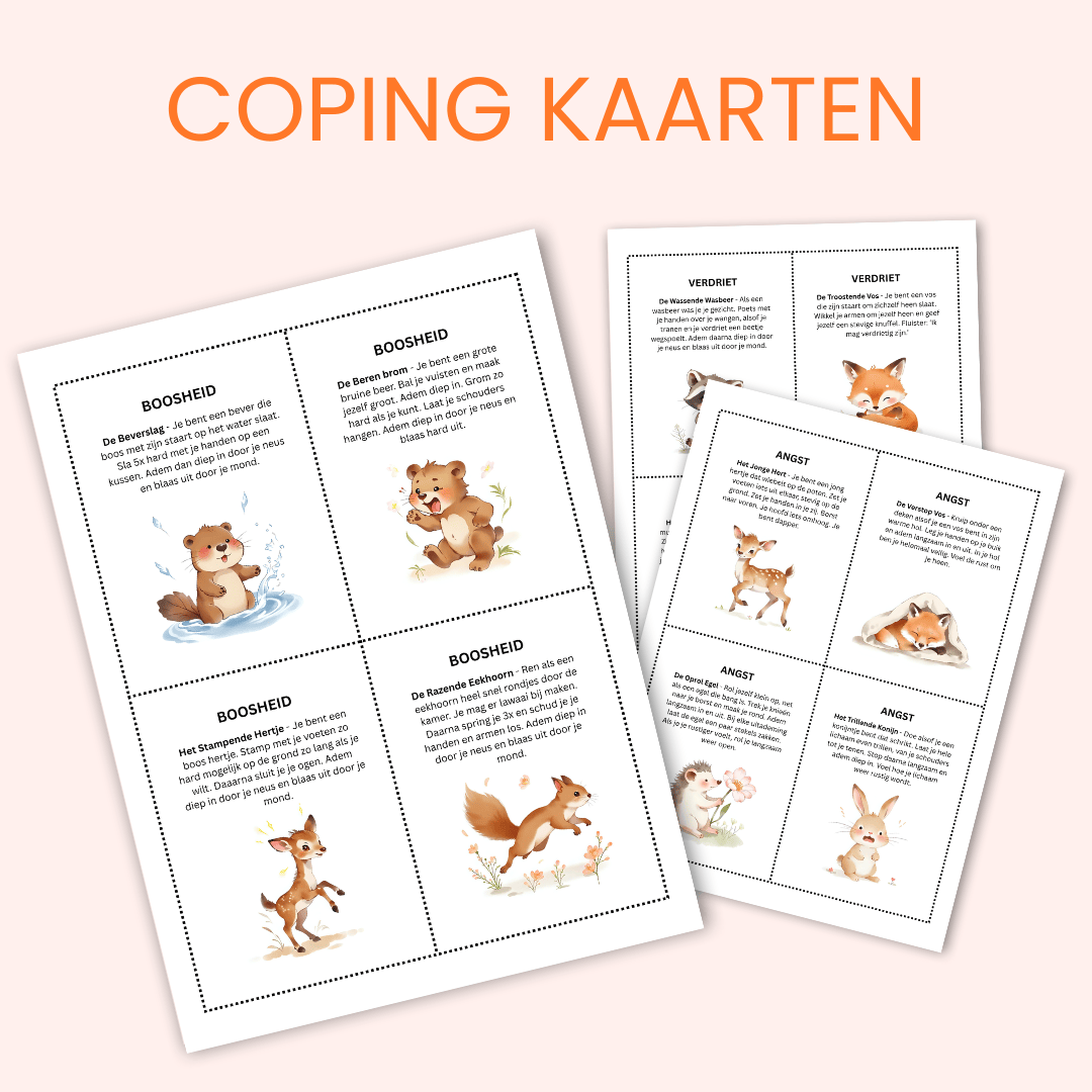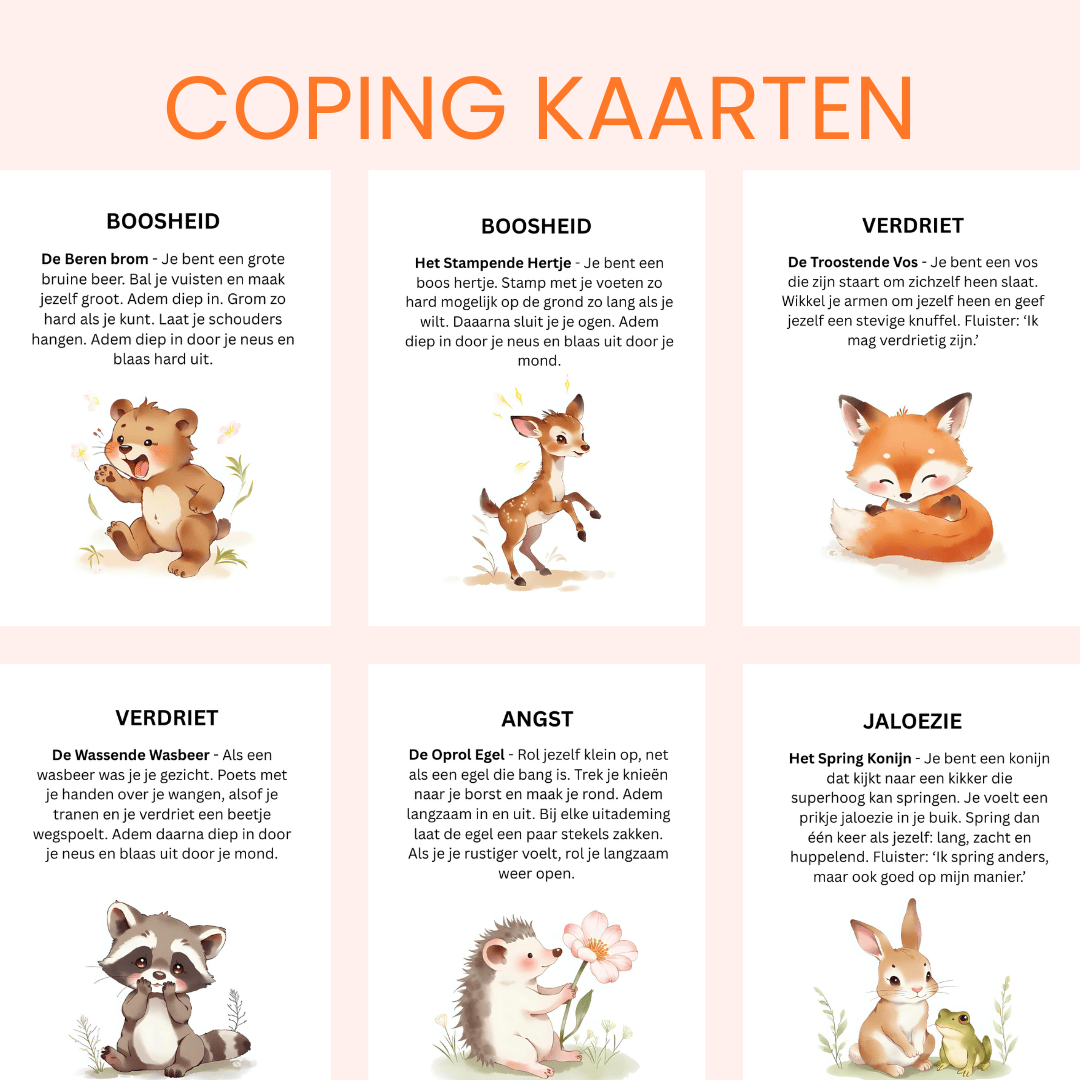 8. Coping kaarten (4 pagina’s) – Met kleine opdrachtjes per emotie: Boos, verdriet, jaloers en angst. Per emotie 4 kaartjes met opdracht en afbeelding in schattige bosdieren thema.