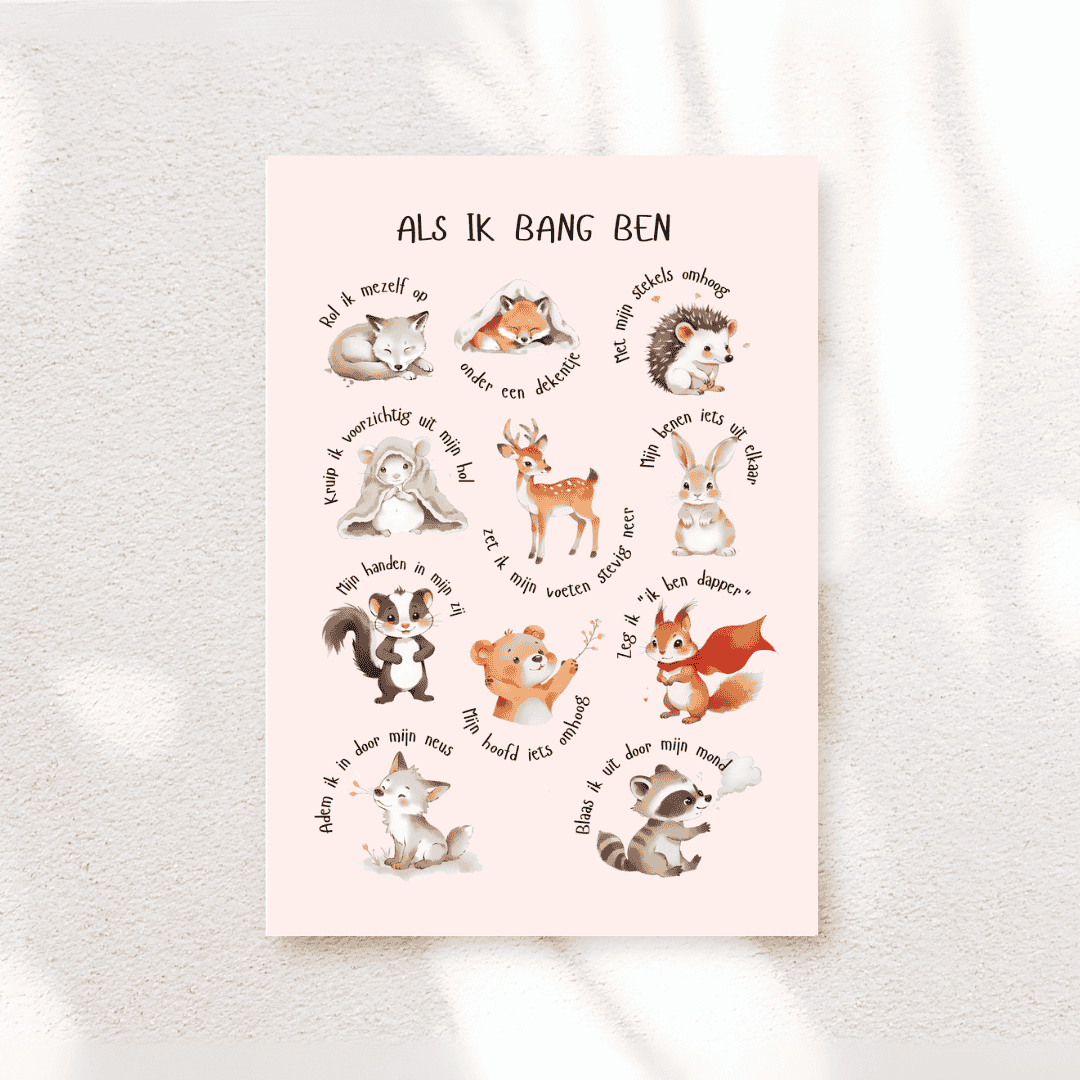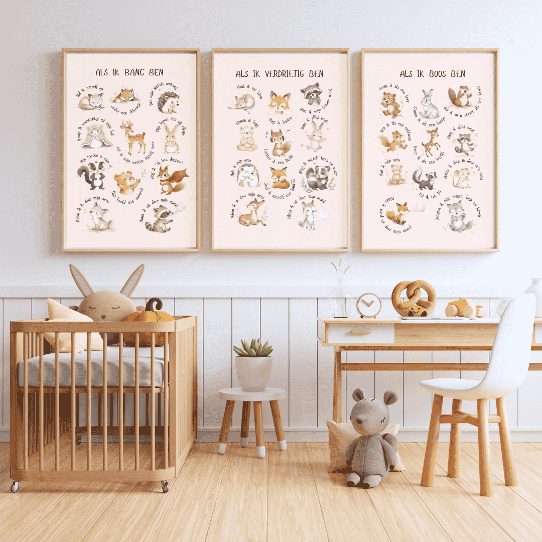 6. Poster set van 3 met emoties en bosdieren – prachtige illustraties vol warmte en rust, met oefeningetjes en lieve illustraties van bosdiertjes.