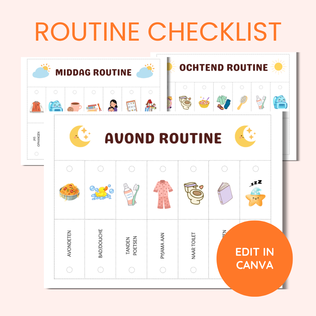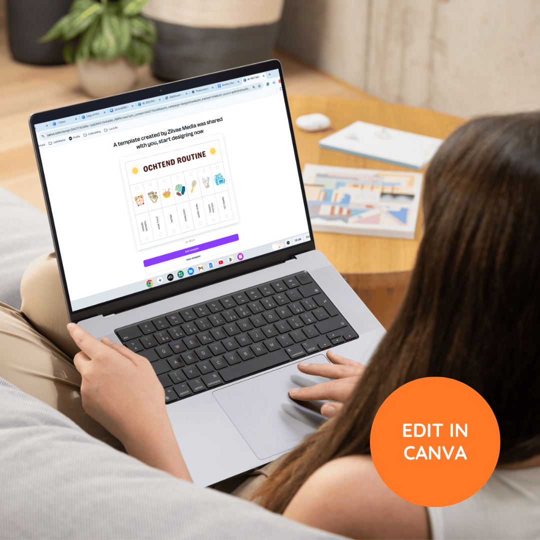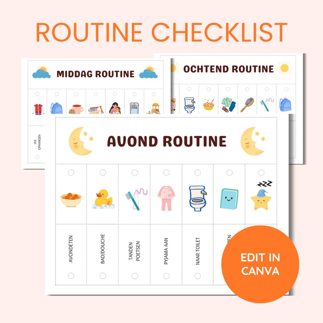 • Een PDF met een link naar het bewerkbare Canva-template – zodat je de routines kunt aanpassen aan jouw gezin. Voeg eigen taken, pictogrammen of namen toe en maak de lijstjes helemaal persoonlijk!