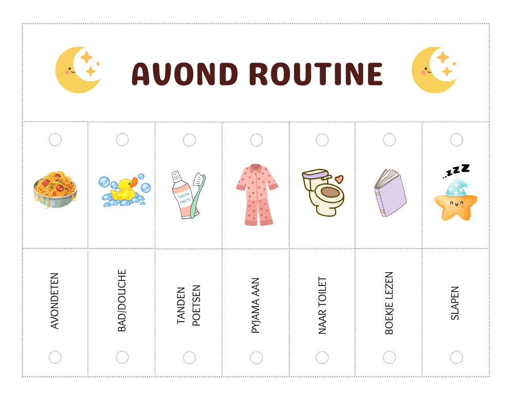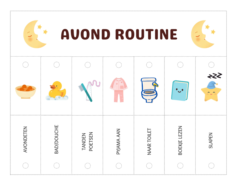 • 🌙 Avondroutine – pyjama aan, tandenpoetsen, boekje lezen, slapen.