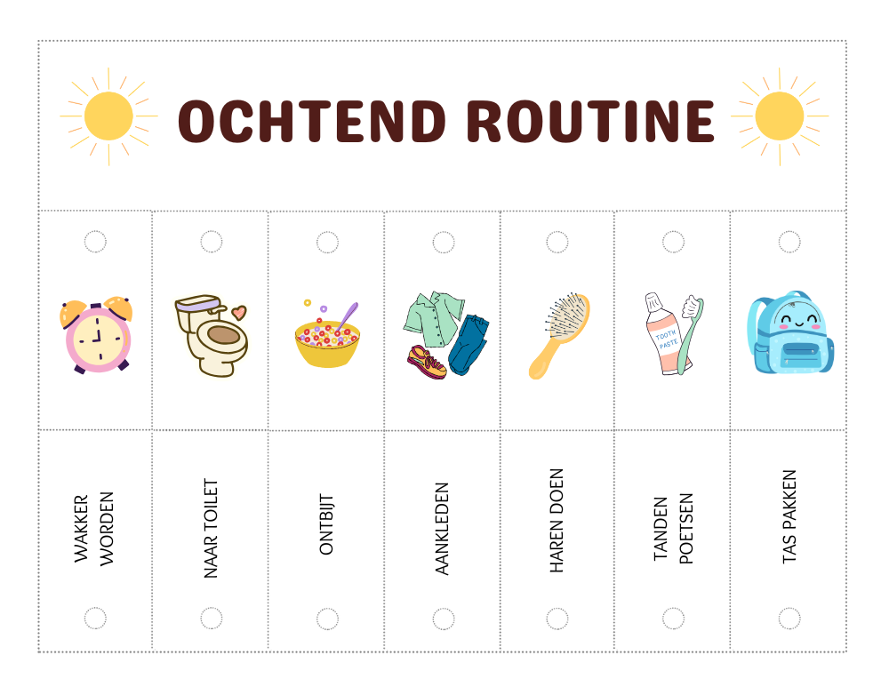• ☀️ Ochtendroutine – aankleden, ontbijten, tas inpakken, tandenpoetsen.